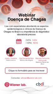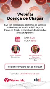Nesta segunda-feira, 14 de abril, às 16h, a Wiener lab. e a Câmara Brasileira de Diagnóstico Laboratorial, CBDL promovem uma live sobre a Doença de Chagas para celebrar o Dia Mundial de combate à doença. Os aspectos epidemiológicos e clínicos da doença no Brasil e a importância do diagnóstico precoce serão abordados por três especialistas: a Dra. Fernanda Rick, médica infectologista, especialista em saúde pública com mais de 15 anos de experiência na gestão de epidemias; a Dra. Josely Chiarella, farmacêutica e diretora técnica da CBDL; e Marcelo Gonçalves, farmacêutico bioquímico da Wiener lab.