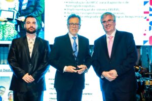 A primeira homenagem da noite foi para o médico pediatra e endocrinologista, ex-presidente da Sociedade Brasileira de Patologia Clínica e Medicina Laboratorial (SBPC/ML) e cofundador e ex-presidente da Sociedade Brasileira de Triagem Neonatal e Erros Inatos do Metabolismo (SBTEIM), Dr. Armando Fonseca.