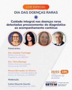 A Live “Cuidado Integral nas doenças raras detectadas precocemente: do diagnóstico ao acompanhamento contínuo”, terá as participações do presidente executivo da CBDL, Carlos Eduardo Gouvêa, como moderador; da presidente da SBTEIM, a médica geneticista Dra. Carolina Fischinger; da ex-presidente e diretora da SBTEIM, a médica endocrinologista Dra. Tânia Bachega; e da nutricionista e coordenadora de nutrição do Departamento de Nutrição da SBTEIM, Renata Bernardes de Oliveira.